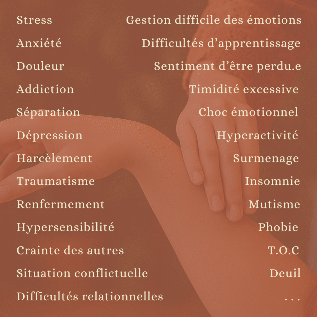 Ma licence en psychologie et mon expérience d’enseignante me conduisent à proposer aux jeunes des séances axées sur leurs émotions en utilisant la kinésiologie de manière adaptée à leurs besoins et à ce qui émerge pendant la séance.